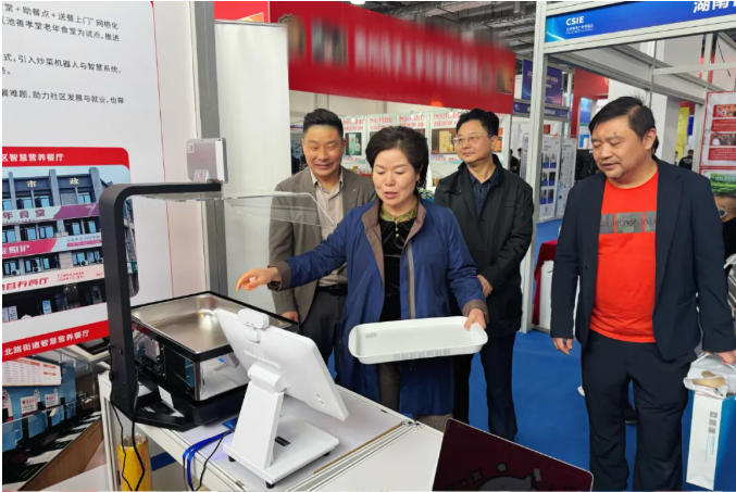 湖南省民政厅厅长黄东红,长沙市民政局党组成员、副局长夏天莅临展台,详细了解智慧助餐系统的运作原理和鱼艺福老年食堂目前的市场化发展和运营情况,并强调要持续优化创新,为更多老年群体提供便捷、优质服务。