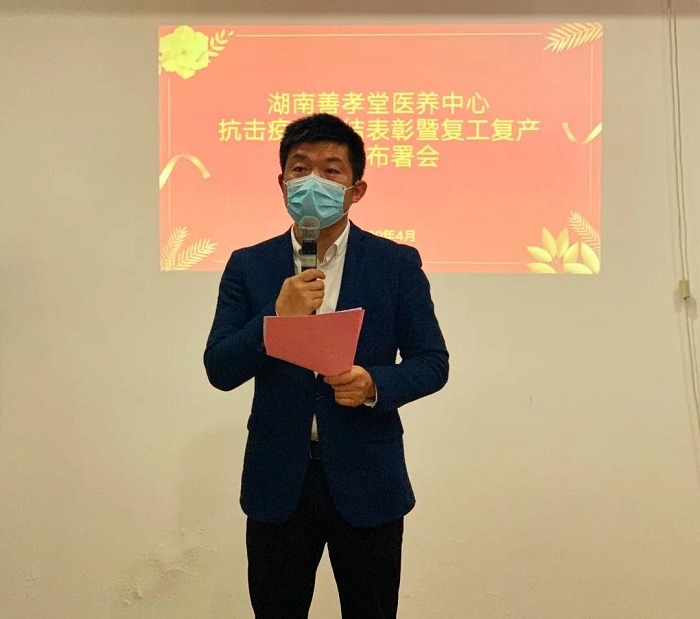 自新冠肺炎疫情爆发以来,湖南善孝堂医养中心上下齐心,做到100多名在住老人及60名员工疫情安全风险零事故,得到了区级民政部门的高度肯定。为表彰疫情期间在各岗位表现优秀的部门及个人,谋划接下来的工作,特在2020年4月11日晚6点30分举行“抗击疫情总结表彰暨复工复产工作布署会”。